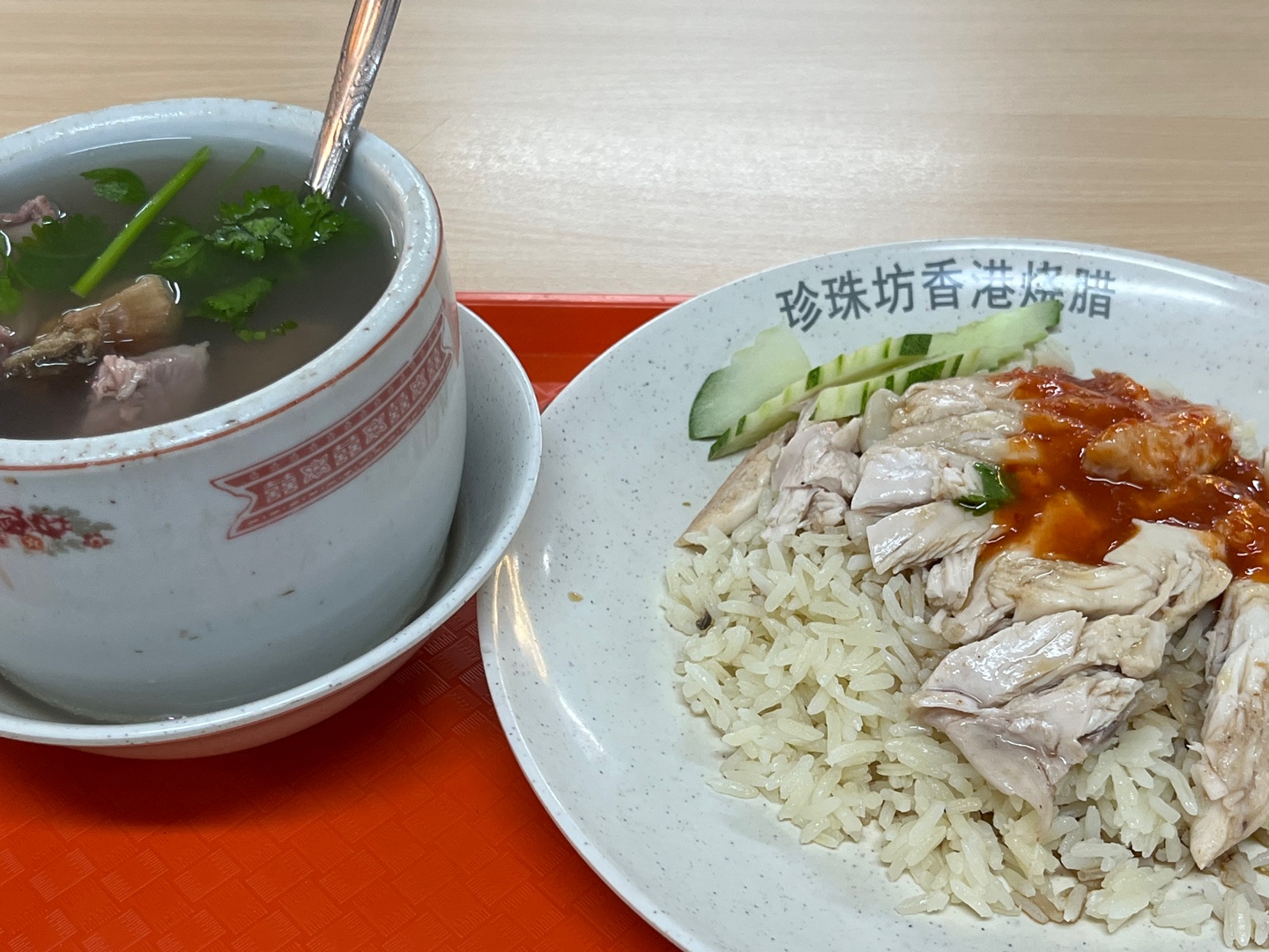 싱가포르 있는 동안 2번 갔는데 첫날은 돼지 내장탕과 같이, 마지막 날은 오리 국수와 같이 치킨라이스를 먹었습니다.